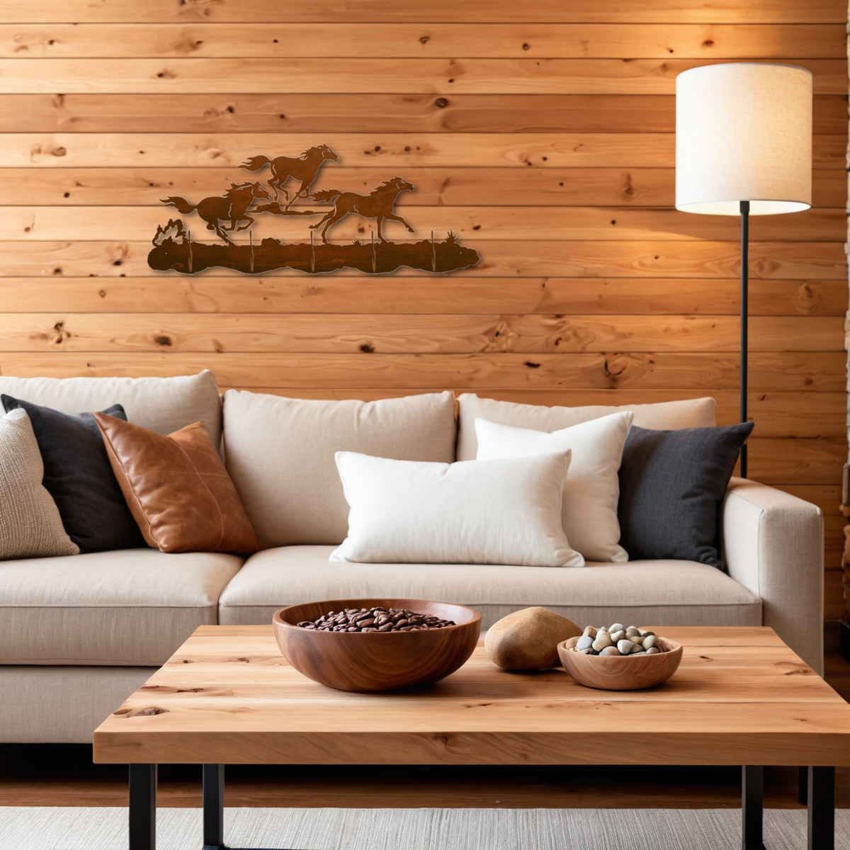 Gallop into rustic elegance with the Wild Horses Scenic Five Hook. This 36x14x3-inch, 9.5-pound masterpiece brings the beauty of horses into your home. Stay organized while celebrating your love for these majestic creatures with this unique hook.