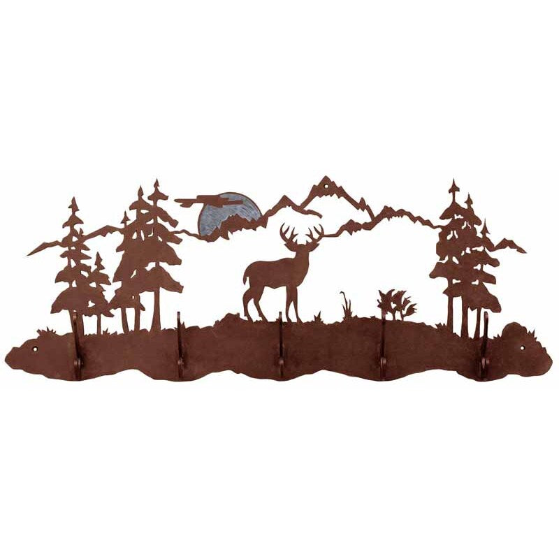 The Mule Deer Scenic Five Hook Burnished is a 36x14x3-inch masterpiece, weighing 9.5 pounds. Enhance your decor with the grace and beauty of the mule deer.