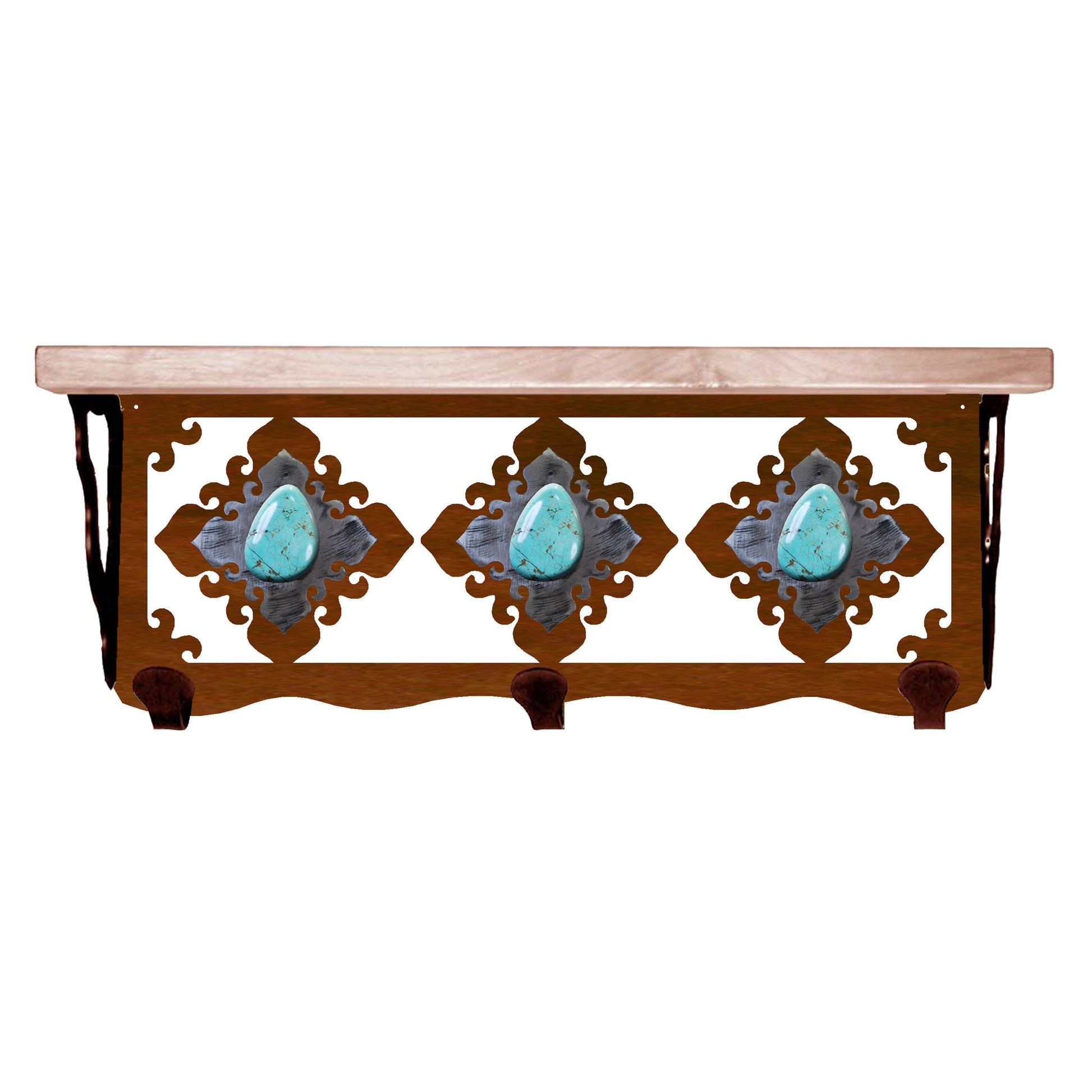 Elevate your decor with the Turquoise Stone 20" Hook Shelf by Ironwood Industries. Its vibrant turquoise accents and functional design make it a striking addition to any space. Showcase your items in a stunning Southwestern style.