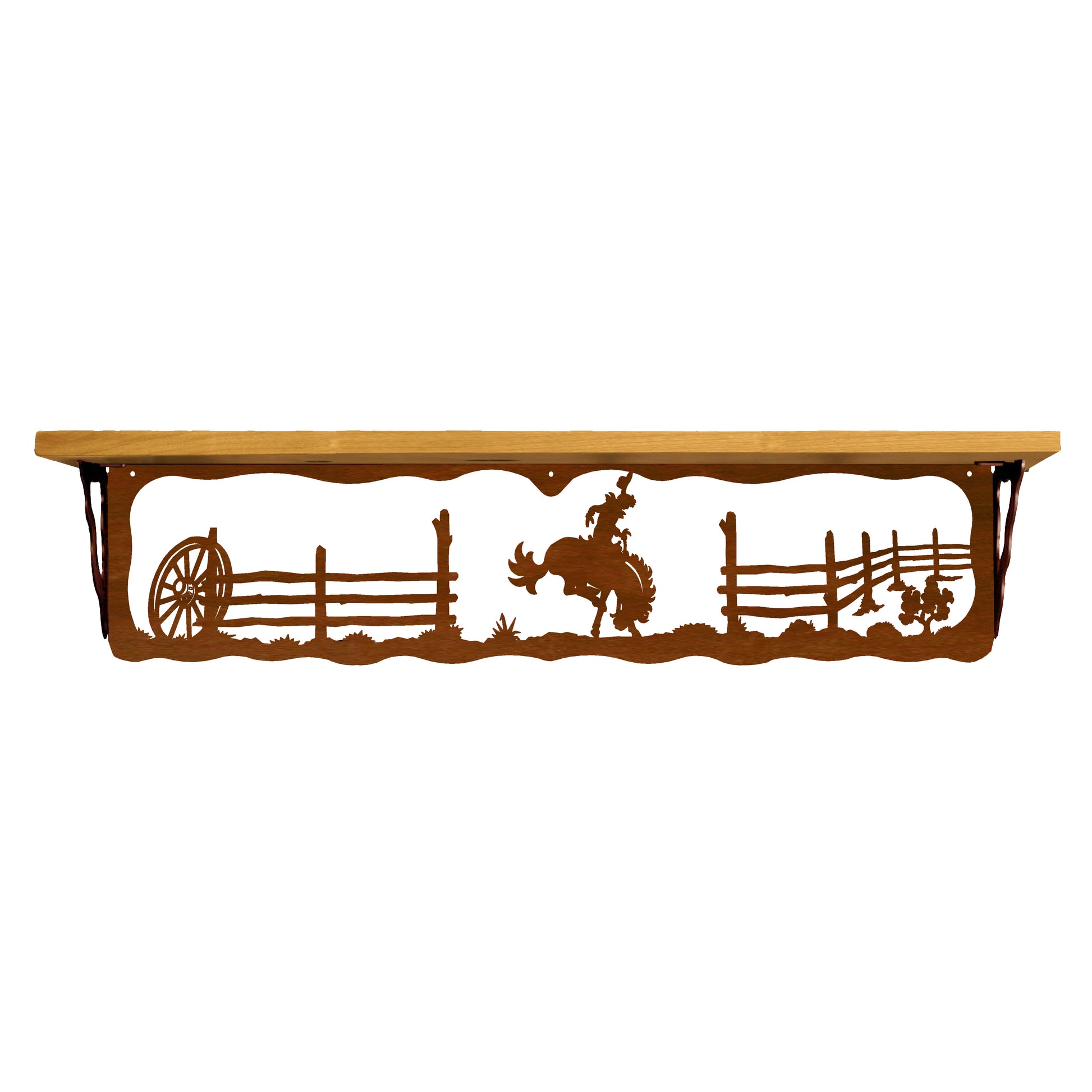 Saddle up your decor with the Bronc 34" Shelf from Ironwood Industries. Measuring 34x8.5x7 inches and weighing 9 pounds, this larger shelf is a canvas for your Western-themed treasures. Elevate your space with the spirit of rodeo and add a touch of rustic charm to your decor.